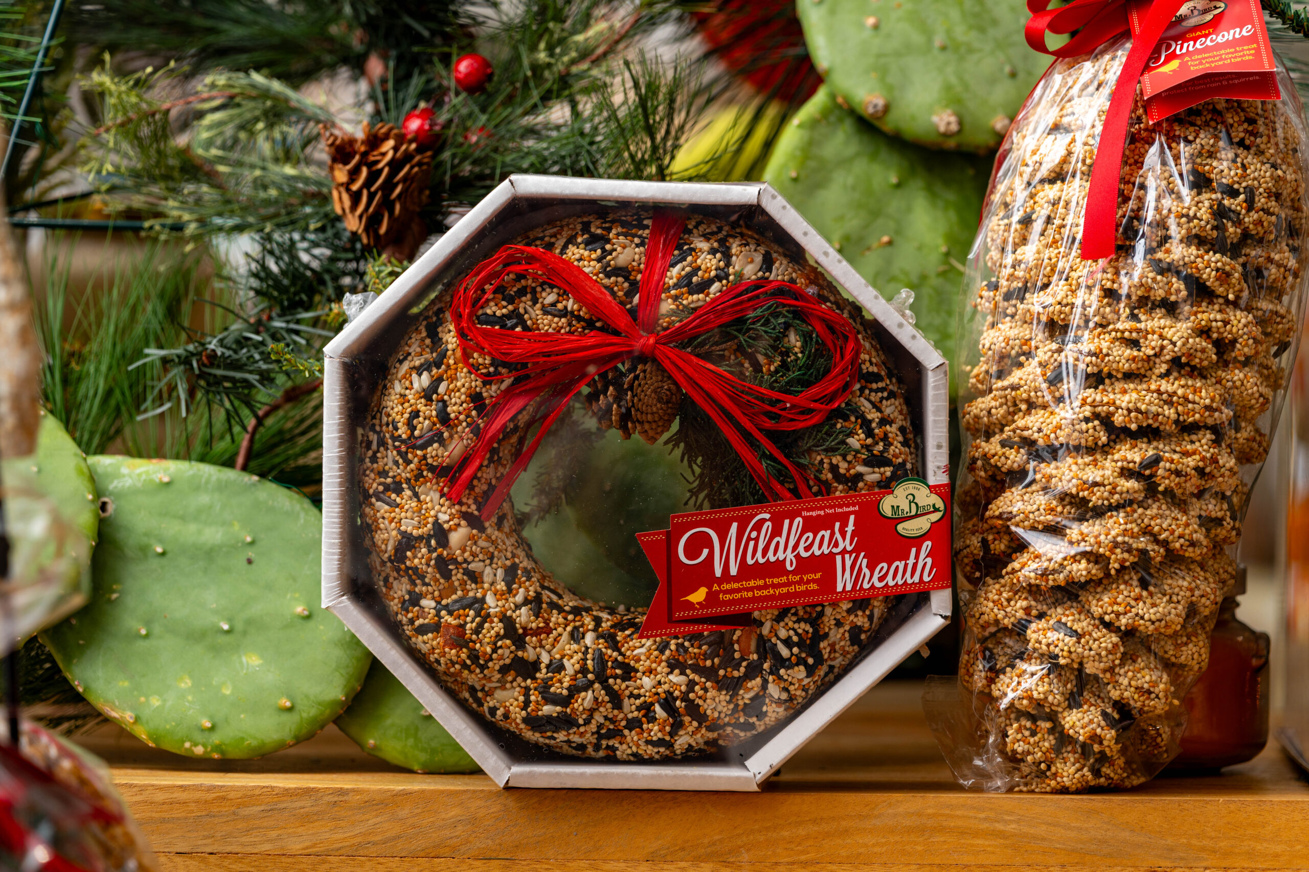 Solid seed, nut, and fruit wreath that is almost to good to give to the birds. Nice presentation in tray. 9″ dia. Hang with raffia bow or provided net.