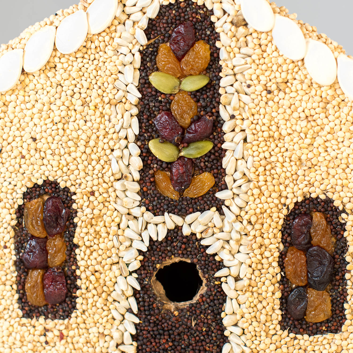 An exterior grade wooden wren house decorated with a variety of seed, butterflies and flowers. A…